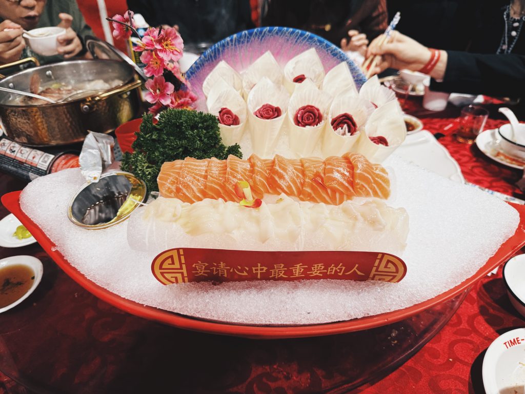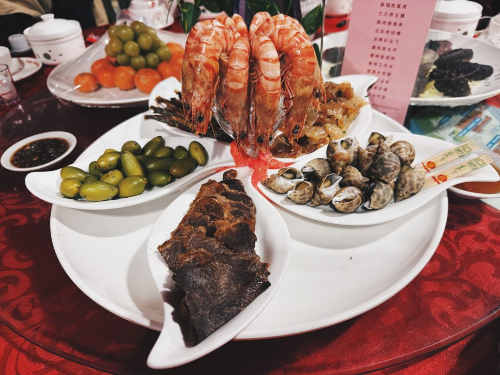 整晚吃下來,常聽見「tsiekˊ o」、「tsiekˊ o」,時而要我們接住裝飾燈玻璃底座的玻璃盆,又時而要接住吐著乾冰的玻璃盤。同桌有在地長樂朋友看不下去,幫忙我們指揮如何配合依姐的節奏。我時常擔心自己拿不穩就碎了,真佩服這些阿姨還要一次送餐搬上數盆,送到每個桌上。
