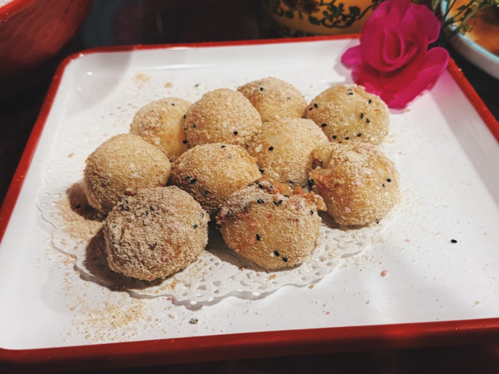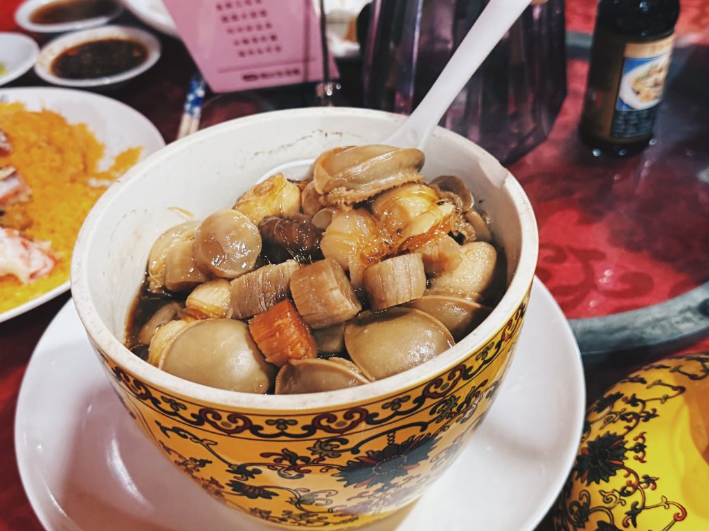 甜點部分,總計兩道:一是「時時好運來」,上桌就聽見這代表「時來運轉」的解釋,總之比馬祖的糍大顆多了,像麻糬。另一道是「冰糖蓮籽羹」,即蓮子甜湯。