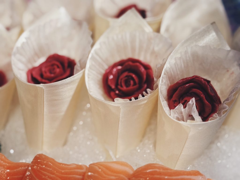 其他菜部分,「五彩繽紛螺」是紅椒芹菜清炒螺肉片;「雁峰香燒排」是和馬鈴薯塊拌炒的糖醋排骨;「龍騰彩雲飛」是龍蝦美乃滋;「象蚌三珍冰」是另一道視覺菜,聚寶盆狀的碗公前面插著一張「宴請心中最重要的人」橫幅,後面是兩個裹上生鮭魚片和象拔蚌片的直圓柱,附上已經鋁箔密封調製好的芥末醬油,再來是有巧思的玫瑰花狀肉醬,是可能加入一點鵝肝的甜口食物,和鮭魚與蚌肉交替著吃,口感很特別。