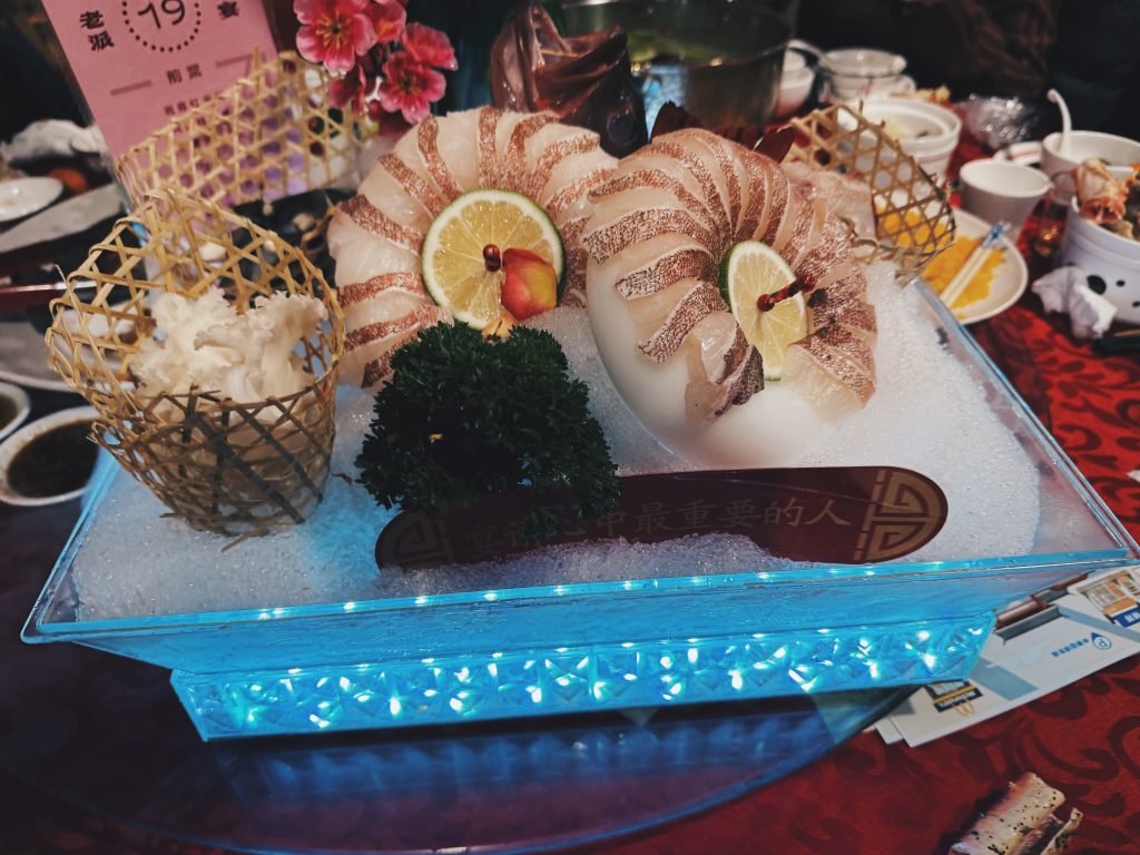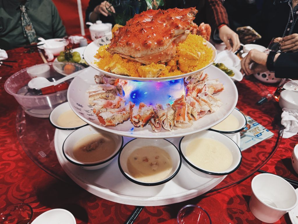 主菜部分,第一道「海馬龍膠露」是花膠搭配清燉豬排骨。入座時已經放好的碗盅,需要自己用一旁備好的火柴點火。在清澈湯底中,還有一隻小海馬。海馬用醬油醃過,吃來像魚乾。「涮鍋東星班」是宴菜走向五感體驗的開始。變換燈光的四方底座上,有個放滿冰塊的方斗狀玻璃碗公,前面插著一張「宴請心中最重要的人」橫幅,後面是安在圓環柱上的魚肉,環中用檸檬片點綴。另上一鍋加芹菜、蒜苗、紅棗的清湯,不明究理的人會不知道,原來這是代表自己涮魚肉的意思。這種浮誇的呈現方式,很像台灣早期辦桌,至今可在彰化沿海見到的做法。一盤魚和一鍋湯就佔桌面一半,所以不能吃太慢,否則會被上菜的叔叔阿姨們催促,要你就算接了菜也沒地方放,只能趕緊清盤。「三元帝王蟹」上菜時,叔叔阿姨便直白地喊著帝王蟹拼盤來了,眾人也因為看見這道三層架上還覆著雪場蟹殼的高聳料理而驚呼著;疊成的三碟盤中,由下而上分別包含:蟹肉蒸蛋、清蒸蟹肉,以及避風塘蟹。