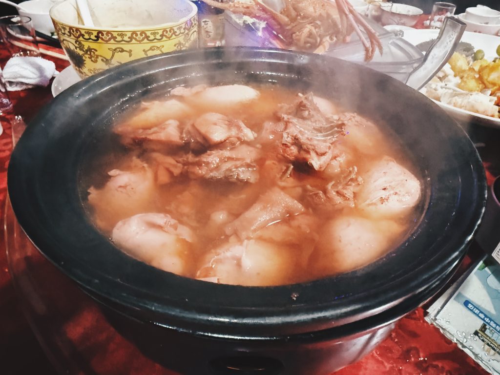 佛跳牆源自福州,可相對台灣用炒扁魚加水,再放入排骨、雞骨,連同三星蔥及紅蔥頭熬出湯底,除海鮮食材外,還配上筍乾、鳥蛋、芋頭塊、排骨酥和乾栗子,並半數炸過;在福州,即便辦酒,「佛聞跳牆來」湯底仍偏向傳統做法,也就是一般會在豬蹄、龍骨、雞爪、鯽魚等燉湯底的基礎上,加入冰糖、八角、桂皮等,用黃酒提味、老抽上色。眼前這盅佛跳牆,則是在包含大量干貝、鮑魚、金針、花菇和冬粉的食材中(這盅的鴿蛋也有炸過),呈現有滿滿藥膳味、顏色偏暗的湯色;但如果時間夠,湯的膠質應該會更多。